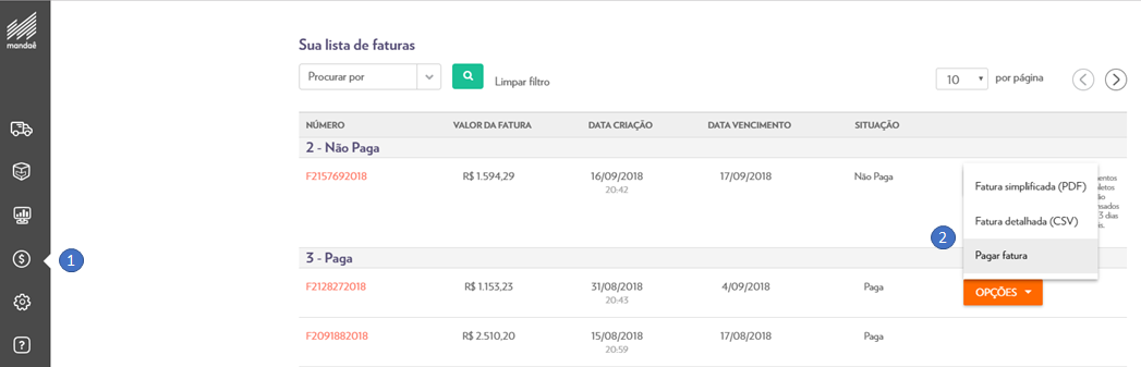 A Mandaê trabalha com faturamento semanal ou quinzenal e o pagamento deve ser efetuado via boleto. O boleto poderá ser pago via internet banking, caixas eletrônicos ou direto em agências bancárias. A cada emissão de fatura, disponibilizamos em sua conta na opção "Faturas" o boleto para pagamento, e também a fatura para conferência dos gastos e conciliação.