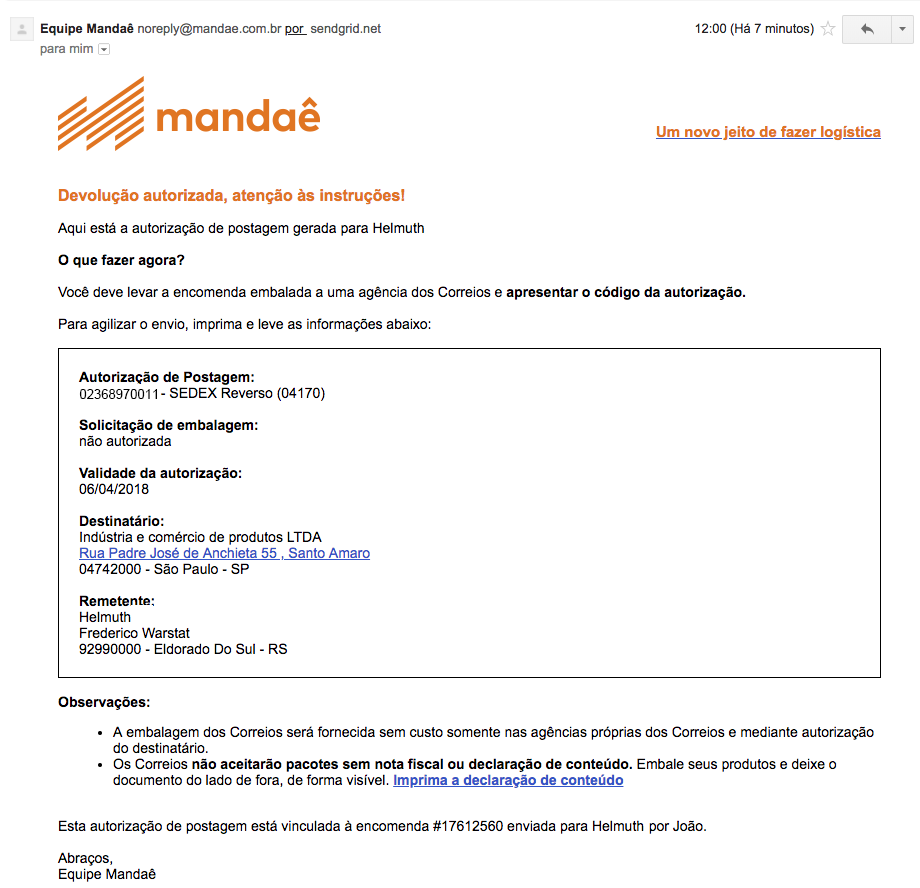 Autorização de postagem para encomendas não enviadas pela Mandaê