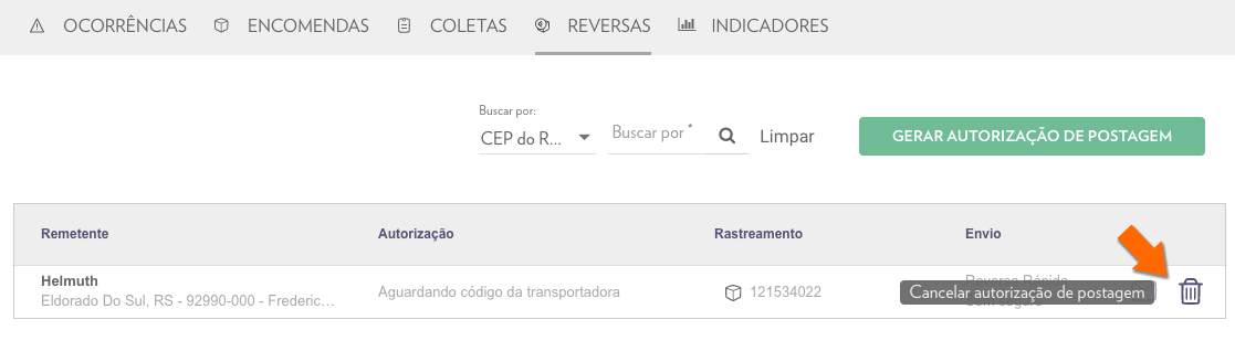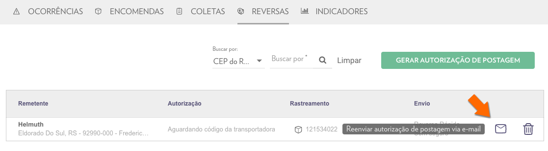Caso o remetente não tenha recebido o e-mail, o lojista poderá acessar o painel de encomendas da logística reversa e reenviar as instruções através do ícone de reenvio disponível em cada encomenda.
