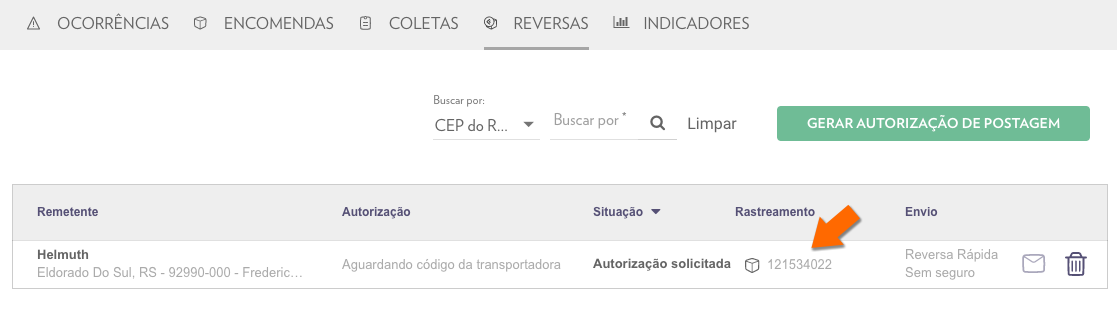 4 - Encontro a encomenda na lista e clique no ícone da logística reversa - à direita