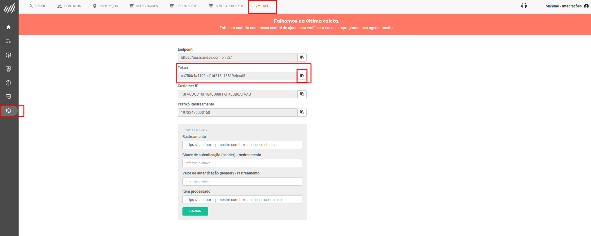 Após fazer o login no sistema da Mandaê, clique na engrenagem de Configurações e depois em API, localize o campo Token e clique no "papelzinho" para copiar: