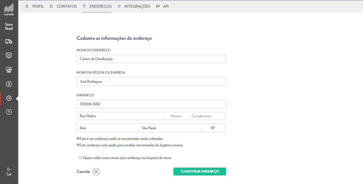 3) Em Endereços você tem a possibilidade de: Adicionar um novo endereço de coleta, definir seu endereço padrão e excluir um endereço.